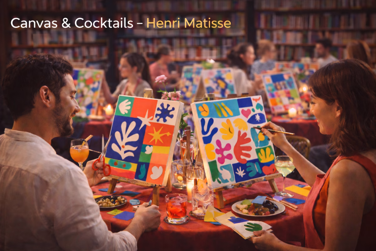 Inspiriert von den berühmten Cut-Outs von Henri Matisse taucht ihr an diesem Abend in eine Welt aus Farben, Formen und kreativer Freiheit ein. Mit Schere, Papier und Farbe gestaltet ihr euer eigenes, modernes Kunstwerk – spielerisch, intuitiv und voller Ausdruck. Bei einem Cocktail in der Hand entsteht eine entspannte Atmosphäre, in der Kreativität ganz leicht fließt und Kunst zum sinnlichen Erlebnis wird.