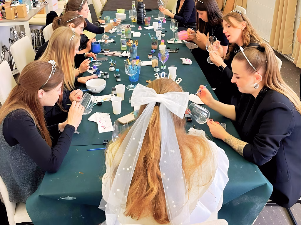 Gestaltet gemeinsam als Team Braut ein einzigartiges Kunstwerk – mit kreativer Anleitung, Musik, Drinks und jeder Menge Farbe!