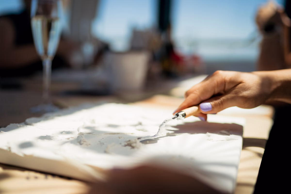Mit einem Glas Prosecco in der Hand, entspannter Musik im Hintergrund und einer einzigartigen Aussicht gestaltet ihr gemeinsam euer eigenes Kunstwerk mit Strukturpaste. Ganz ohne Vorkenntnisse entsteht ein kreatives Erlebnis, das entschleunigt, verbindet und diesen besonderen Tag unvergesslich macht.